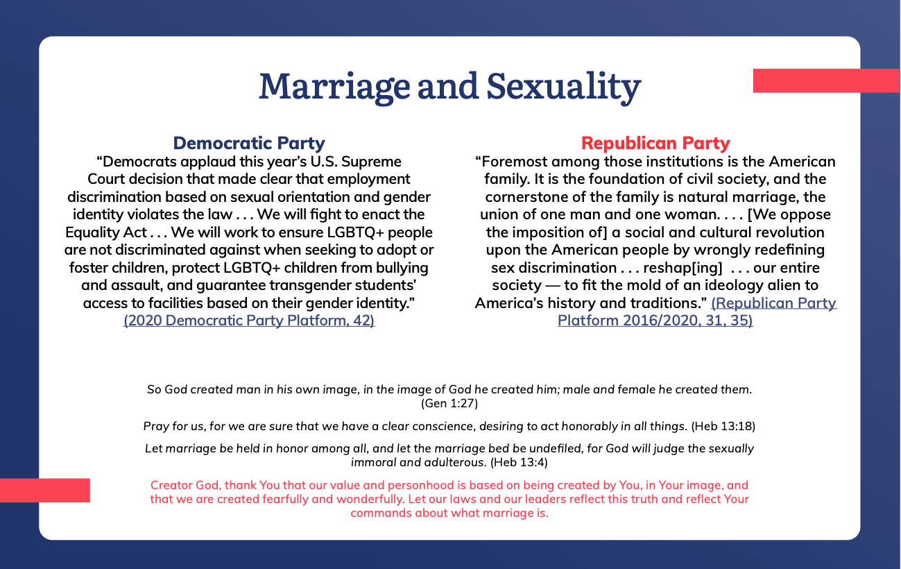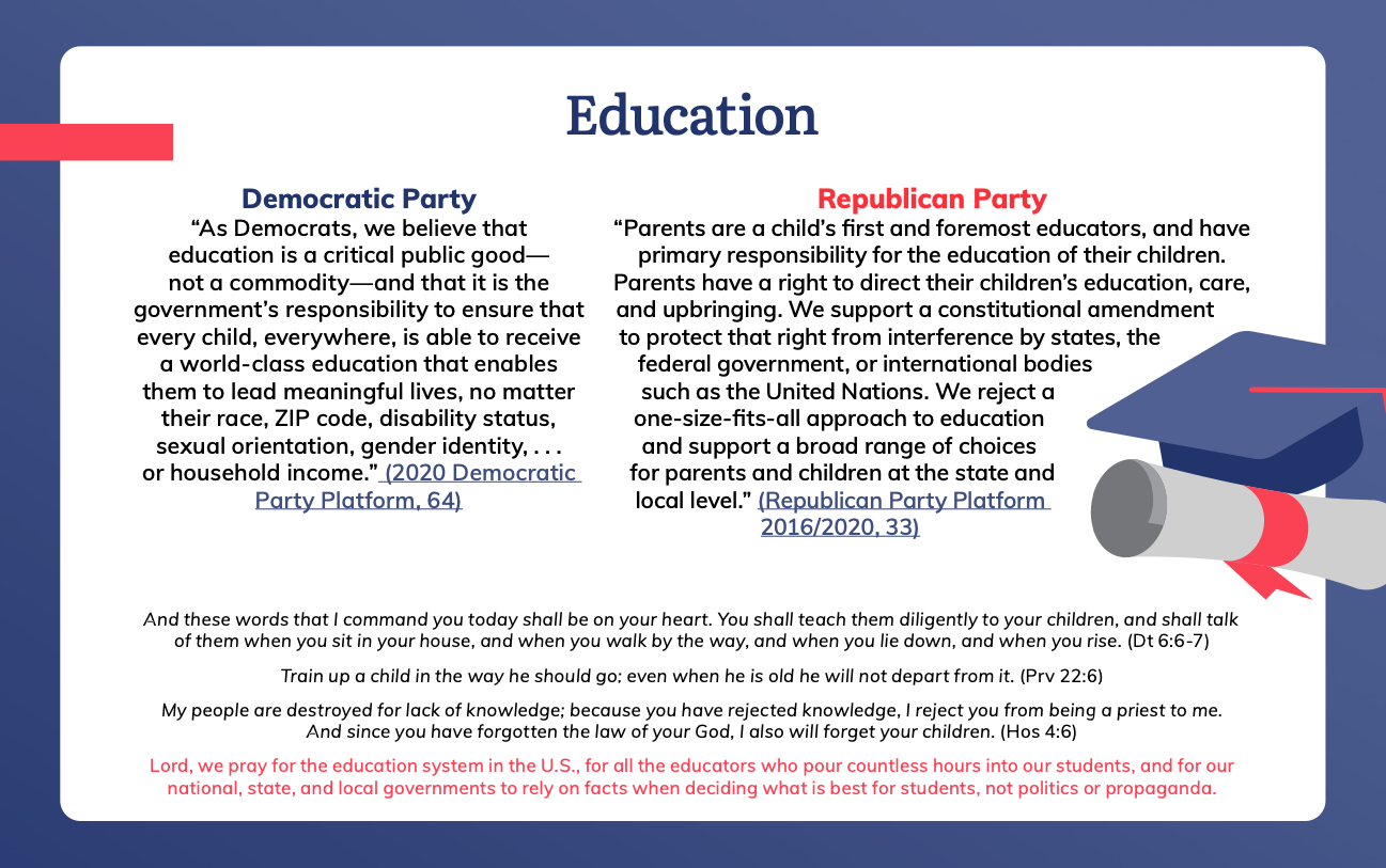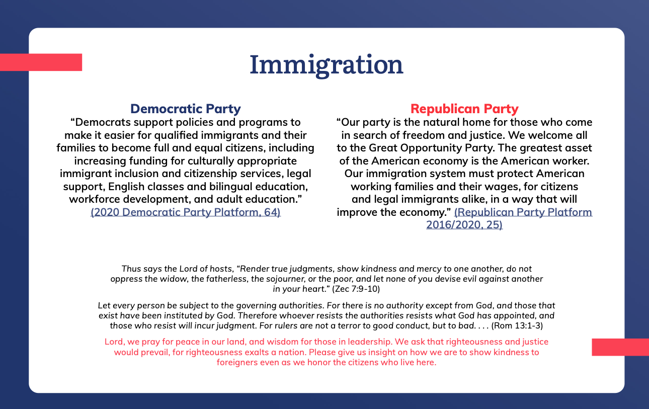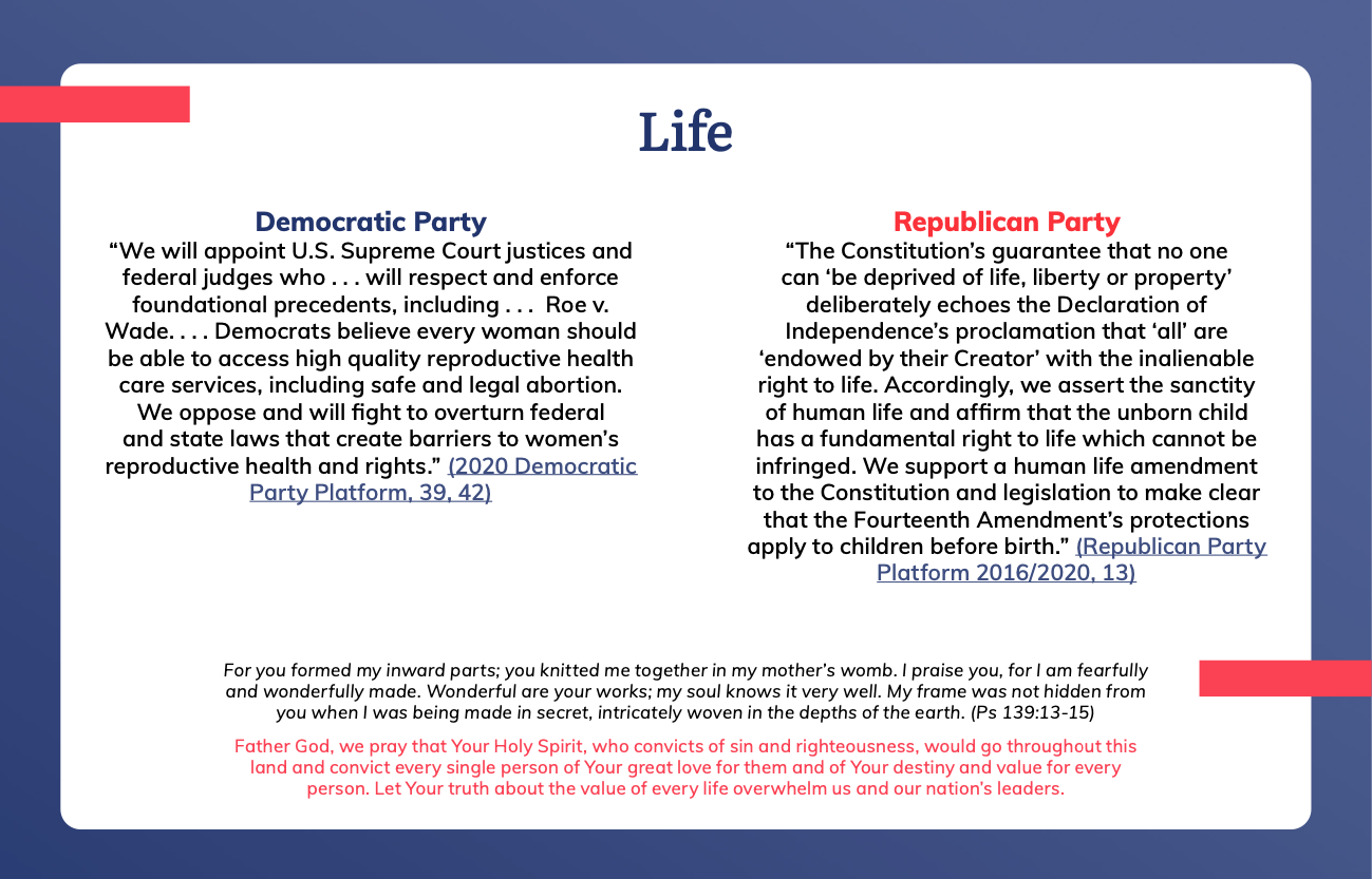 To better help you, I have attached a Voter Prayer Guide below. This guide gives us three things: it lays out the stances of the two major political parties, it gives Scripture to go along with each issue, and lastly, it gives a foundation on how to pray biblically for these issues.